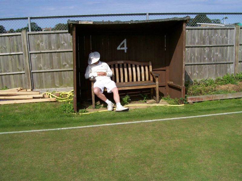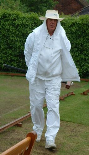 The expected shower came in the middle of the afternoon: not so much a shower of rain as a tropical downpour, heavy enough to stop play for a short time. During this period everyone put on some sort of headgear apart from Ian Parkinson; perhaps he felt that the hair plastered close to his head helped create the smooth-headed Monsieur Michelin look.