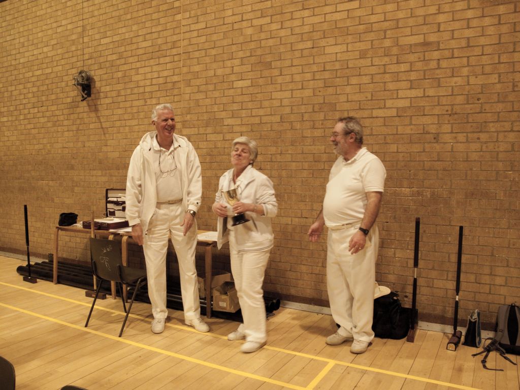What a difference a day makes. Colchester 1 collected the trophy. A much closer contest with nothing decided until the last game between Colchester 2 and St. Downham which ended in a draw, both balls on peg and rover. The final placings for 1st and 2nd were on wins within time, and for 3rd and 4th on net points. It was good to see Roly playing his first game indoors, and in spite of losing he made some good breaks under the excellent guidance by Wendy. The football hooligans watching from the balcony were heard to remark to David Haslam, (himself a closet football hooligan), "Oooo! Some of them are quite young." The trophy was presented to Colin and Georgeen by Neil Chalmers.