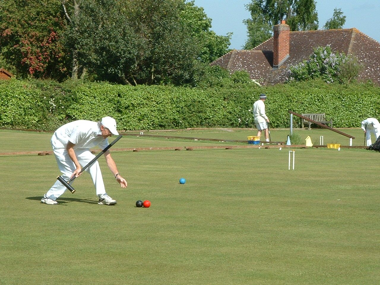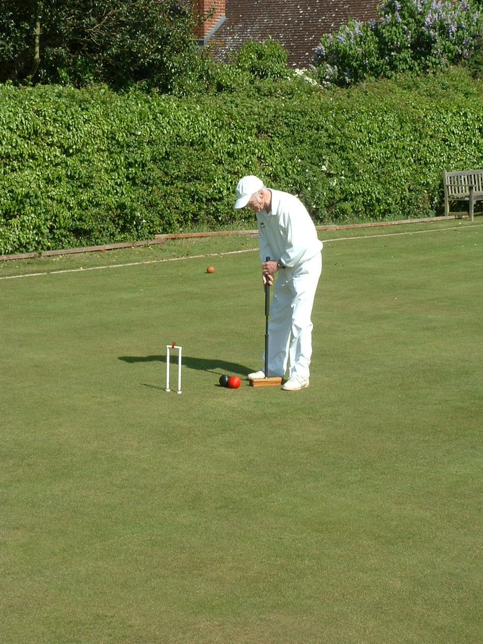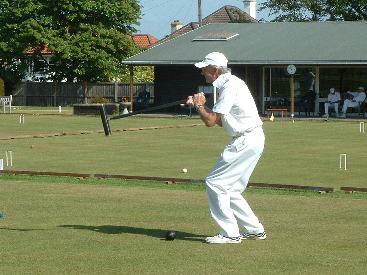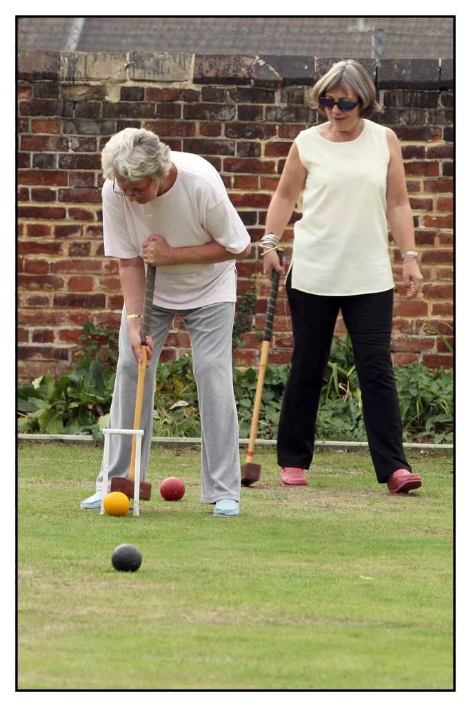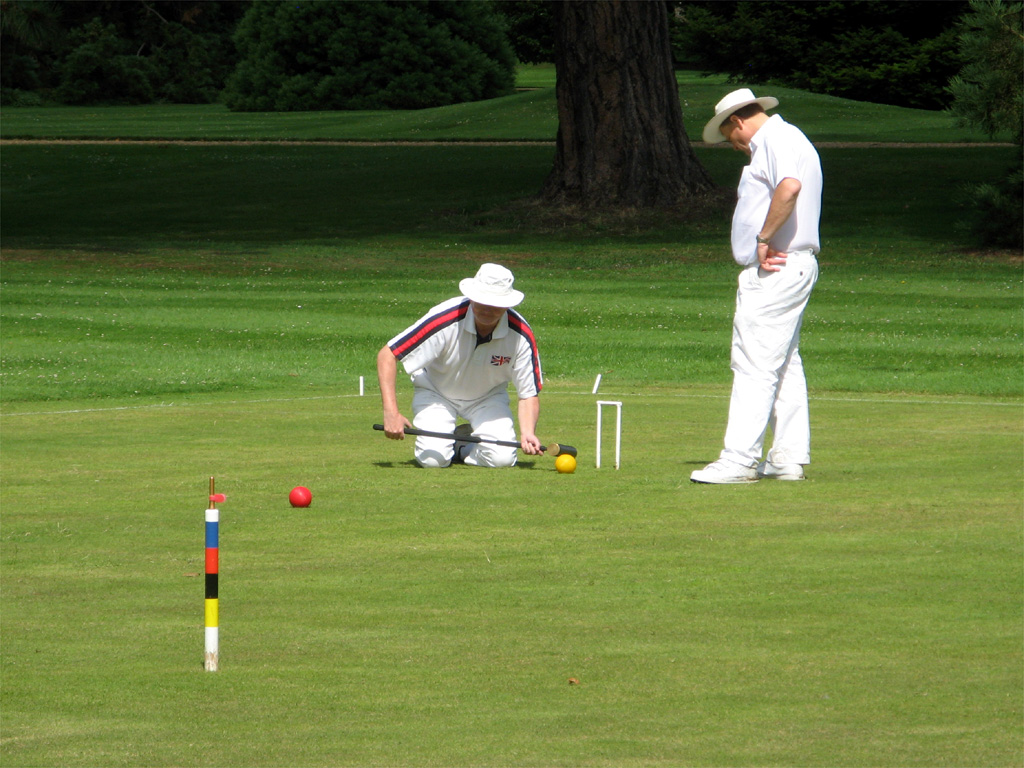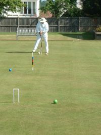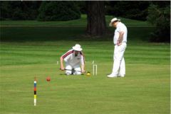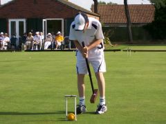 Jonathan Hills (one of the part-timers) played a remarkable shot on the Saturday afternoon: hampered after running 2-back he felt constrained to play the next shot lying flat on his back (feet pointing towards 3-back) with the mallet held somewhere over his left shoulder. Quite why he did this is not entirely clear: something to do with being the only way he could see the point of contact between mallet and ball. Earlier in the day Neil Chalmers had been using his mallet as a back-scratcher (not during the striking period, I hasten to add). Both incidents had spectators scrambling for cameras and camera-phones but unfortunately no-one was quick enough to record either incident for posterity. On the Sunday Georgeen Hemming achieved a remarkable double, winning both her games on a "Golden Hoop". Greatest number of games was played by George Woolhouse, playing no fewer than 10 over the three days.