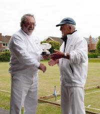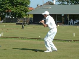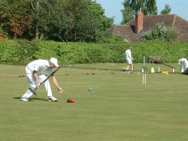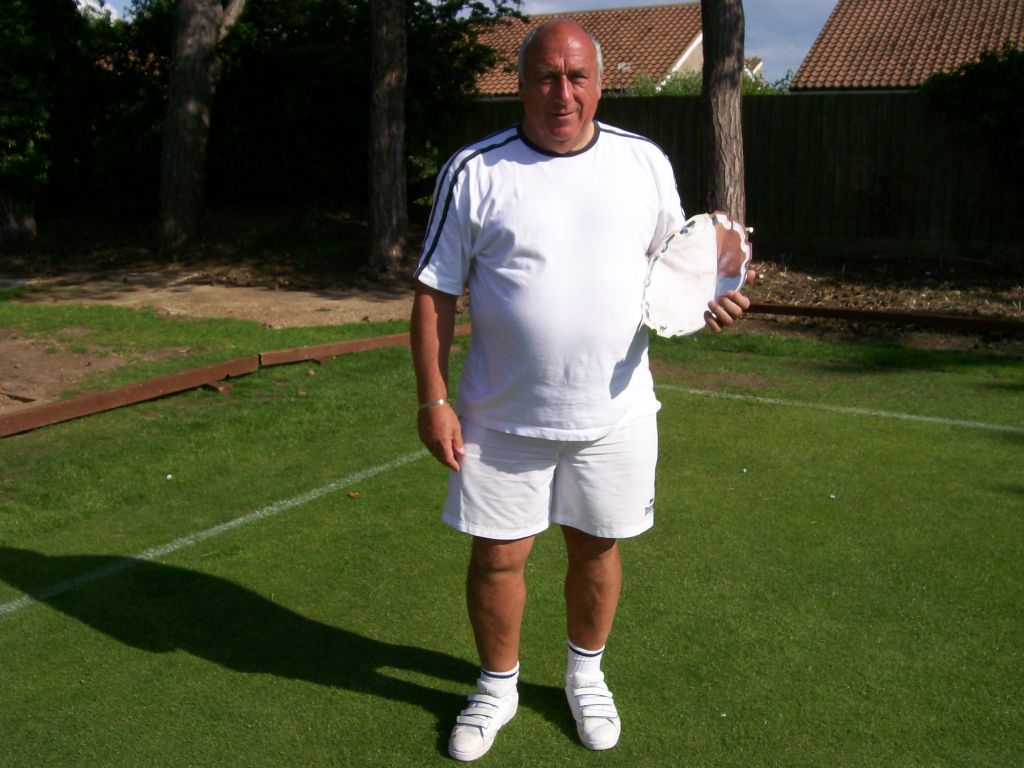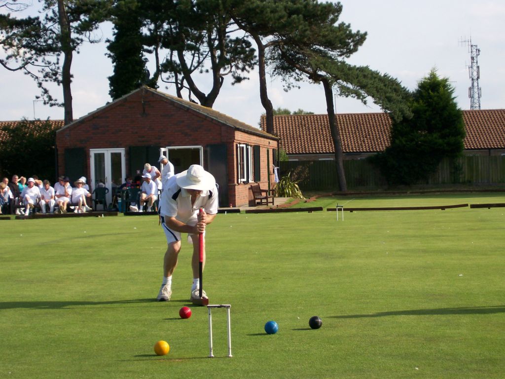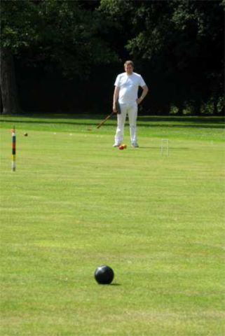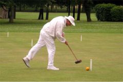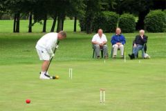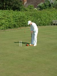 With only 13 entrants, it looked as though the 4 lawns at Colchester were going to be sparsely populated during the weekend. Fortunately, a number of local members were happy to come along for periods ranging from one session to 2 days to help swell the numbers, and the manager had to fill in whenever numbers became odd. This meant that the lawns were full for most of the time. The only obvious drawback to this arrangement was that the manager, normally the most mild-mannered and likeable of men, became stressed to the point of extreme grumpiness, not to say downright rudeness, when having to play as well as manage.