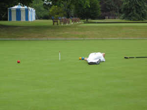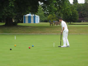 In the afternoon the six singles games were played without time limits. Most of the Oxford team appeared to have come to terms more quickly with the superb, easy-paced but unfamiliar lawn conditions, and progress was generally faster than in the morning. The lunchtime bubbly might also have had something to do with it. In the top game between Wilkinson and Taylor, Wilkinson soon made his first break to 4-back and laid up with a text-book diagonal spread. Taylor missed with his lift shot, and Wilkinson embarked on his TP attempt but unexpectedly missed a roquet after hoop 1, allowing Taylor in until he too broke down hampered after hoop 3. Wilkinson then regained the innings, took his 4-back ball to peg with another tidy leave, and after Taylor had missed the ensuing lift shot finished +23 without further drama.