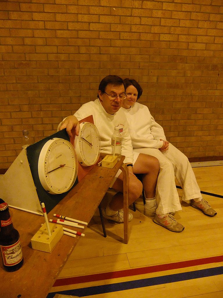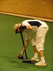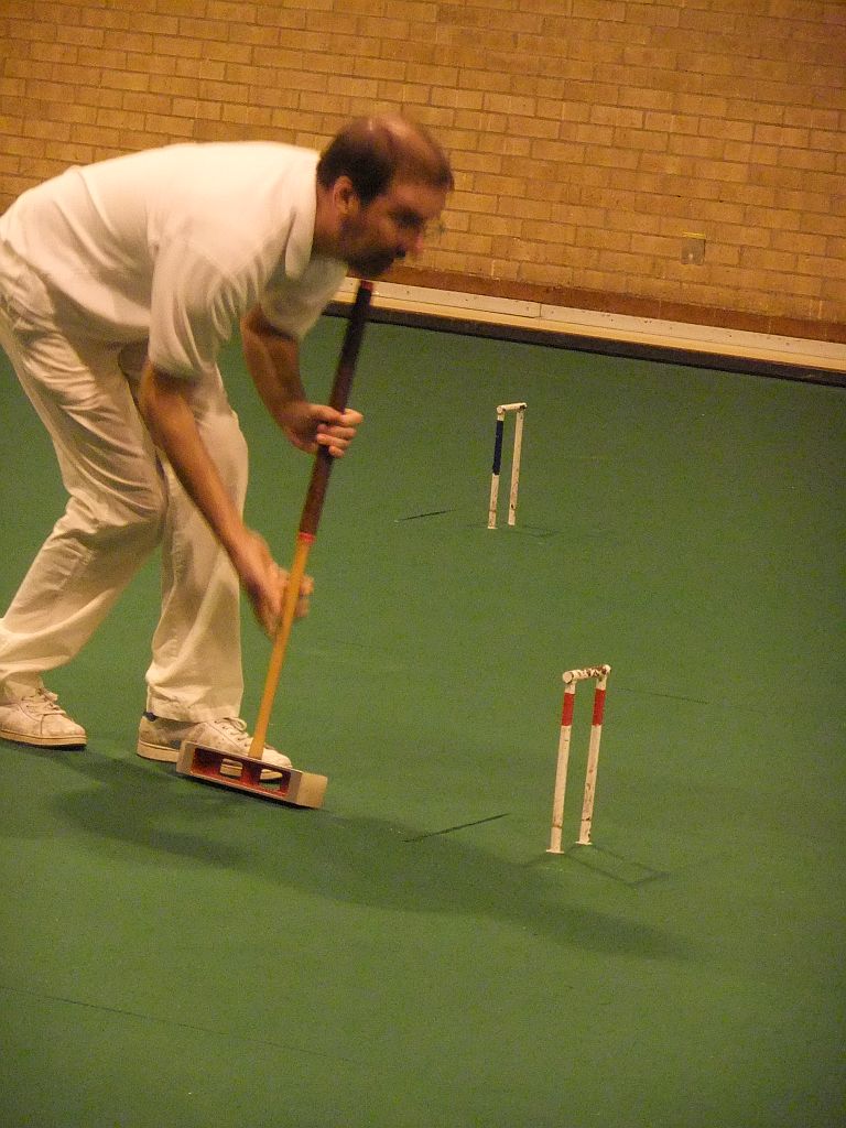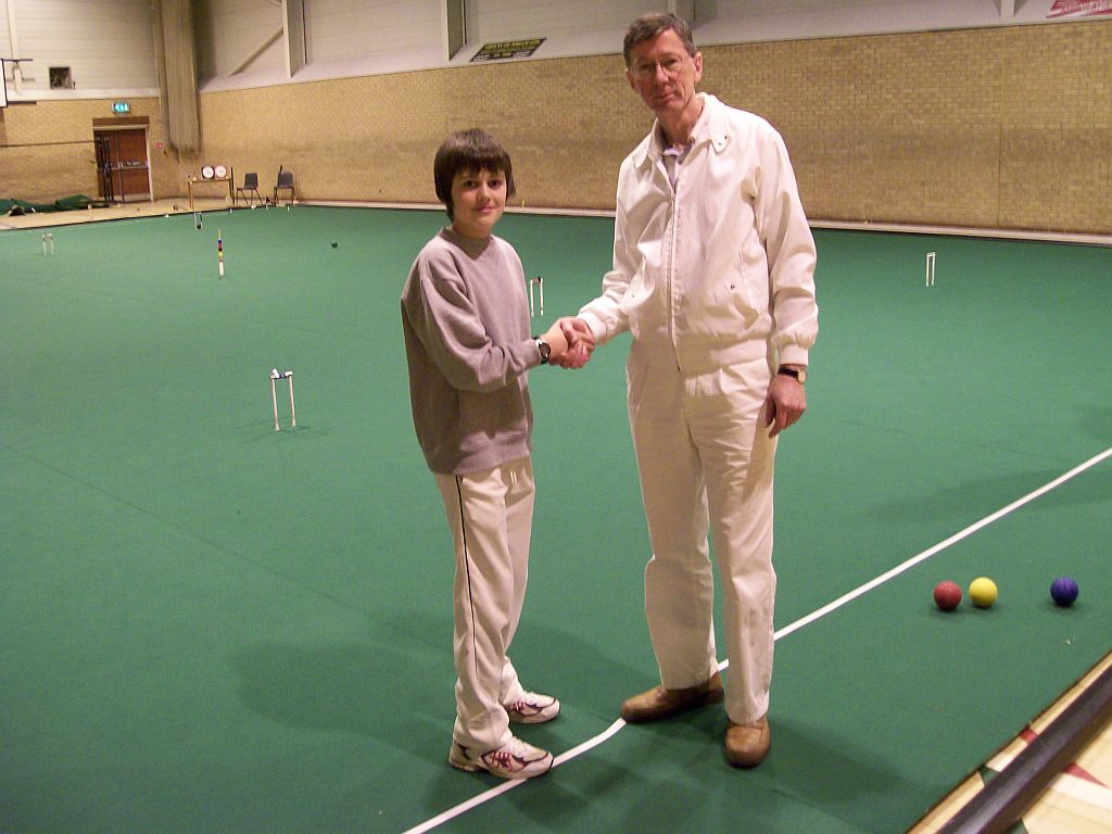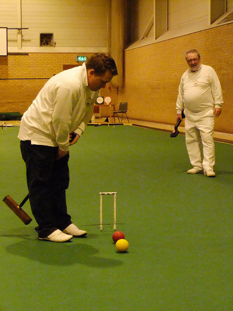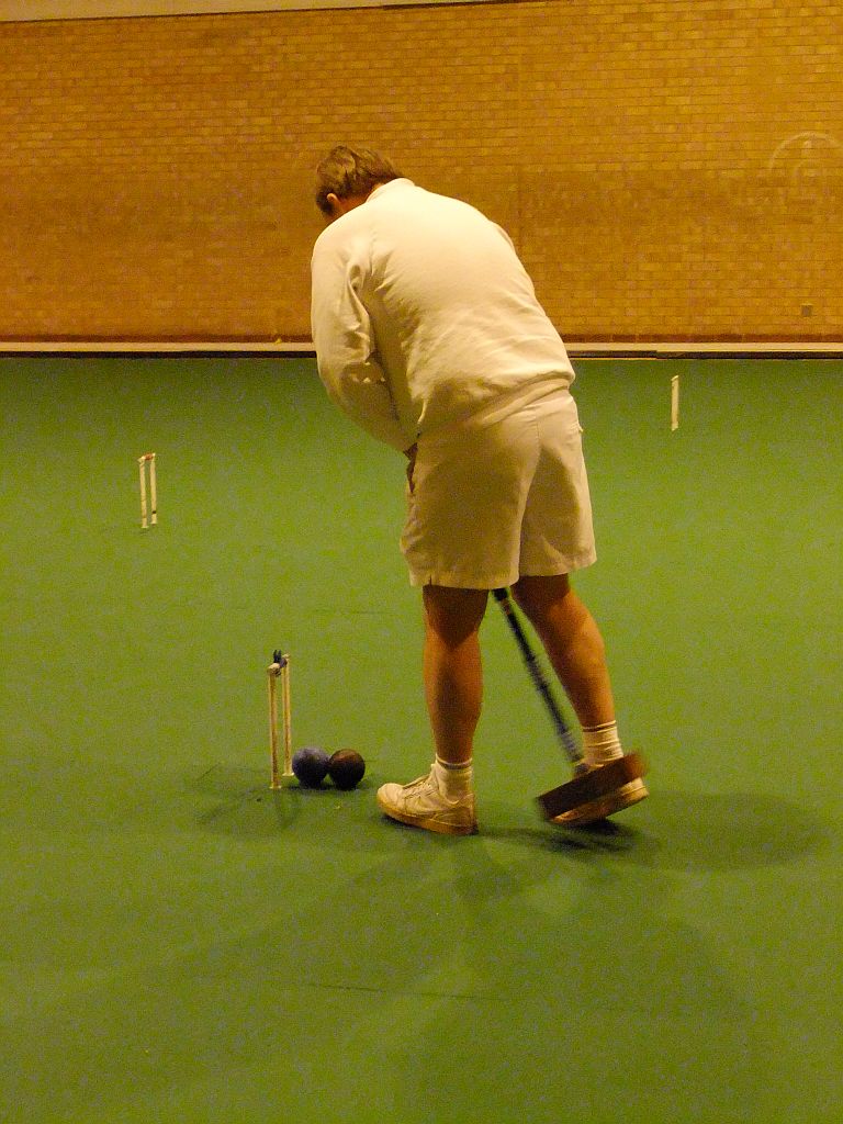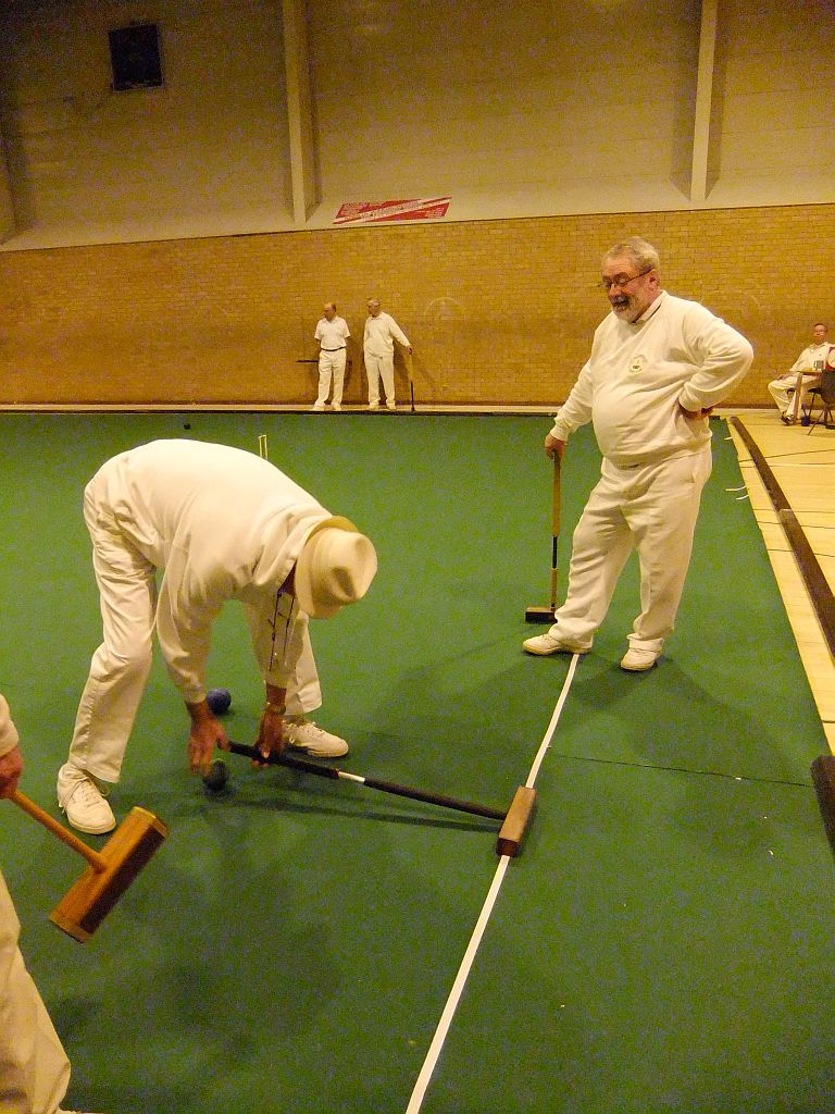 Five times World Champion Robert Fulford is partnering his wife Susan (handicap 24). They are penalised 2½ minutes and their opponents given 2½ minutes extra. This seems a gargantuan penalty especially as Robert rarely covers the court at more than a stroll and when Susan is playing he patiently coaches her as if there were 2 hours on the clock. Robert needs Susan to run 4 hoops and he is then able to go round doing 2 peels on the way (he is not permitted to do more). They lost their first game to Letchworth 1 but not without a struggle. This game featured a fantastic shot from Rob who having been timed out, wired from the opponents and dead on all balls managed to hit the opponents dolly rush with a scatter shot in which his ball ricocheted off his partner's ball with force – his ball then sped a laser guided 11 yards and destroyed a beautiful rush. It wasn't even a double target. This wasn't enough to save the game but he and Susan have won their block but have just lost the final to Block 1 winners – the Races.
