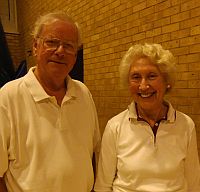 Colin Hemming introduced a new format for today: 10 doubles teams playing two blocks of 5. This meant that each team played 4 games instead of the usual 5. It was a brave and innovative idea. With 20 players there is always someone to chat to and we usually didn't have to play two games back to back. Some had a very late start (our first game was at 11.50) others an early finish. But all in all it seems popular.