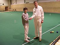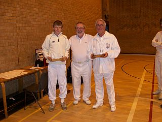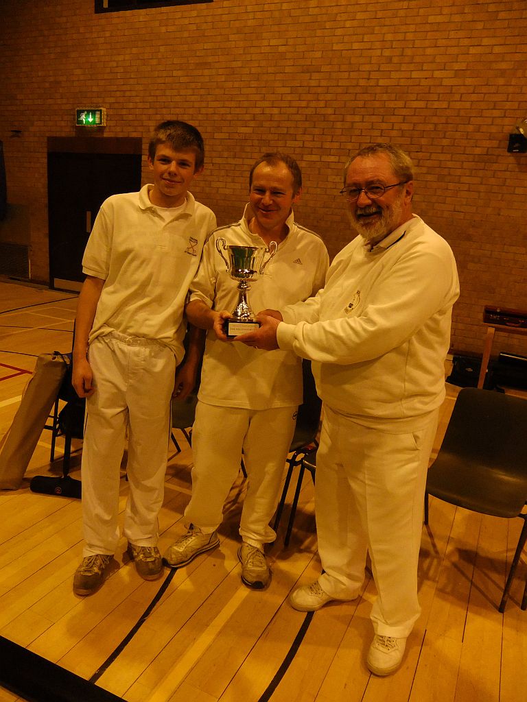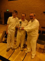 Another fun packed day was had by all. As I walked into the hall and greeted Martin French, who with his partner Phil Eardley, I said, "Gosh. Three peels. That might be tricky!" "We've changed our tactics." replied Martin, and went on to win the tournament with five straight wins. Not an easy feat considering the time was reduced from 25 to 21 minutes due to the lack of time towards the end of the contest. Close in contention were Peterborough. Joe Iddison aged twelve playing off 24, (reduced to 18) played brilliantly under the tutelage of Adrian Kirby and they would have won, were it not for the bullies from Hunstanton 2 who shall remain nameless. No doubt we'll see more of Joe in the future. Many games were very close and hard-fought. Hence the lack of time. Altogether a very enjoyable day as can be seen from the facial expressions of Martin, Colin, and Phil. Instance for special mention? It has to be me missing the peg out from less than a foot! Nonchalantly strolling off the court playing the last stroke with one hand....Whoops.