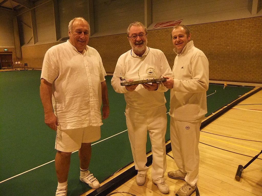After much emailing and arm-twisting, the golf croquet weekend took off, but only with six of the preferred seven teams in the Saturday level play event. Players from Letchworth, St. Albans and Hunstanton joined together to form the teams of St. Alworth and Hun-let, both strong combinations. Three teams from Bury St. Edmunds helped to provide the rest of the competition. The St. Alworth team of Duncan Hector & Terry Mahoney soon got the measure of the carpet and triumphed in three of the five games played, ending in equal second place with David Crawford & Edme Robinette from Bury St. Edmunds. However Team Race from Hunstanton took the trophy after a fine display of perfect positioning and amazingly angled jump shots.