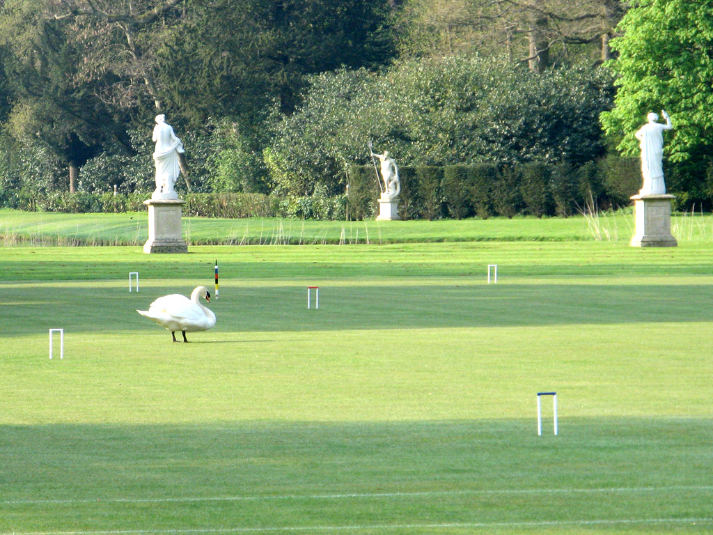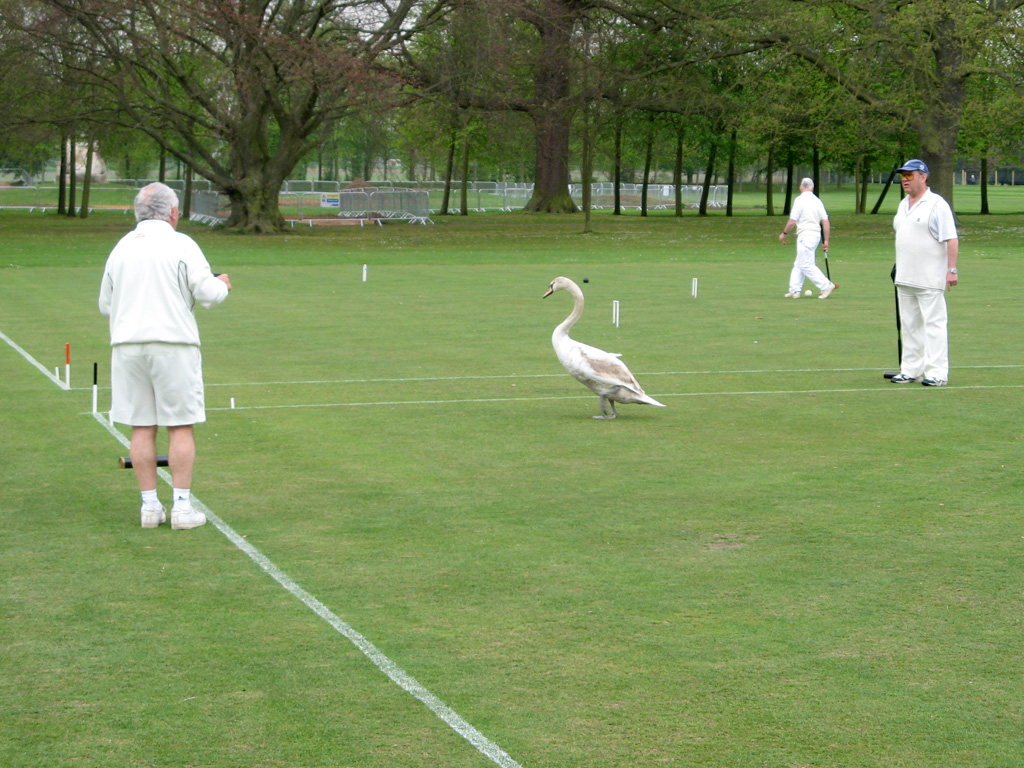 Once the matter of the outside agencies (swans) had been successfully dealt with, play eventually got underway in which the contestants split into three groups of six, (A) Level Advanced, (B) 'B' Level Advanced and (C) Handicap, to determine who would be this year's Champions. However, during the day it was observed by the competing players that they were coming under close scrutiny by the local swan squadron who repeatedly made regular reconnaissance patrols over the lawns. Despite one futile attempt in the mid afternoon from a lone swan to recover lost ground, which was quickly sent packing, things eventually returned to normality for the rest of the day.
