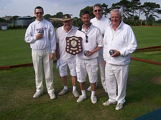 So, after a short break the GMR started with all three teams playing their two doubles pairings. Hertfordshire now moved up a gear and the pairings of Duncan Hector/Nick Mounfield and Ian Mantle/Nick Archer won convincing games against the EACF and Suffolk, whilst Suffolk beat the EACF – so the overall result was a win for Hertfordshire, with Suffolk second and the EACF third. The force behind the idea of this tournament – Terrey Sparks (EACF Secretary) – expressed his thanks to all who made the day such a success – the Team Captains and players, the members of Hunstanton CC who worked hard all day, the catering ladies, and Hunstanton President Ken Wheeler for conceiving the format, managing the day – and finally presenting the fine shield plus commemorative plaques to the successful Hertfordshire team led by Letchworth's Nick Mounfield – supported by Duncan Hector and Ian Mantle from Letchworth, and Watford's Nick Archer.