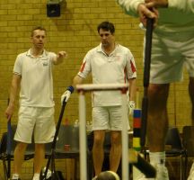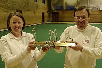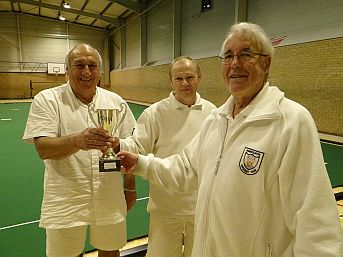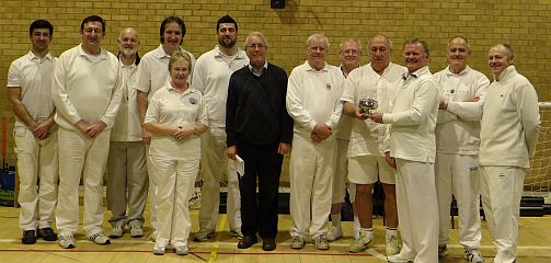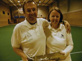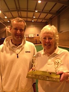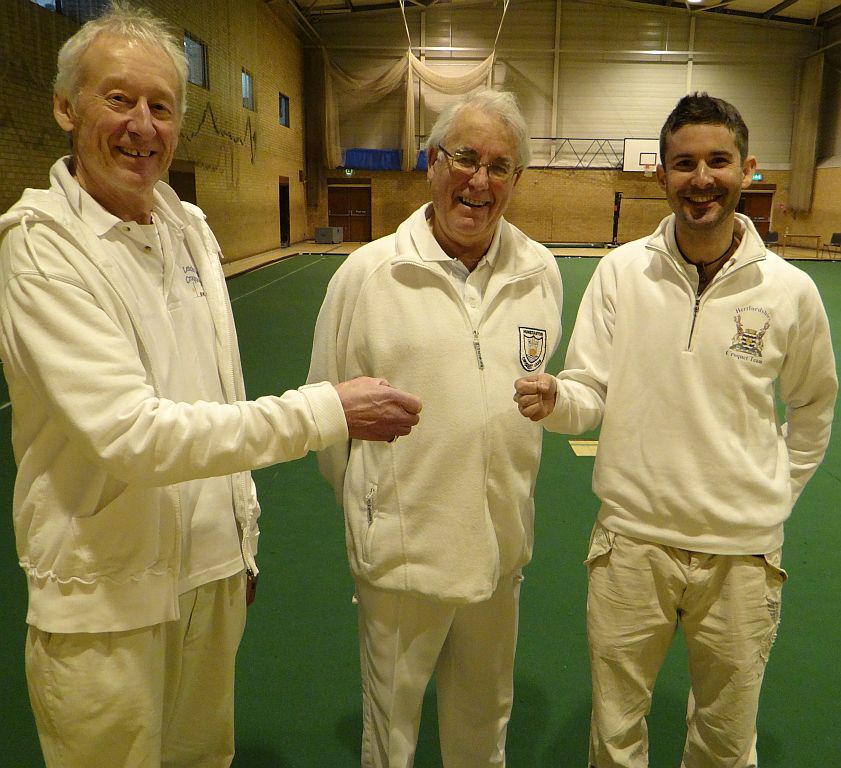 The Letchworth team of Nick Mounfield and Robert Wilkinson ran out the winners of the Soham Trophy on the second day of the indoors winter programme. Play progressed more evenly on the Sunday with no team establishing an early commanding position. However, Peterborough comprising Adrian Kirby and Roly Iddison were quietly making headway winning 3 out of the first 4 games. Despite losing their first game Letchworth started to make a recovery winning 2 and drawing 1 of their next three fixtures. Meanwhile the Bygrave team of Duncan Hector directing newcomer Paul Sinclair around the court were also making good progress winning 2 and drawing 1 of their first 4 games.