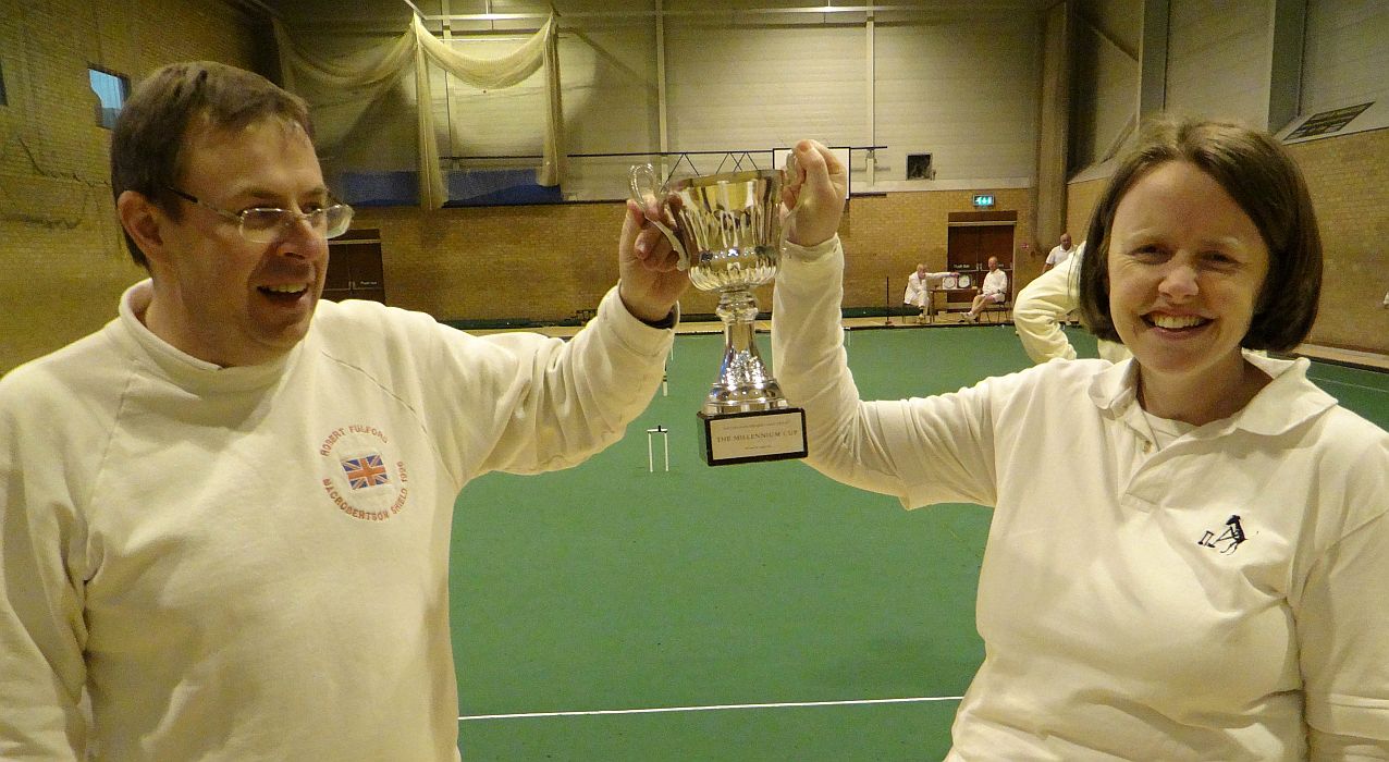 Association CroquetColchester 2 represented by Robert and Susan Fulford won the Millennium Cup beating the Letchworth team, brothers-in-law Jeremy Scott and David Clancey, into second place. At the end of a closely fought day of speed croquet the teams were tied on 4 wins out of 5 and could only be separated by 'who beat whom'.