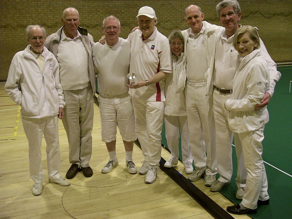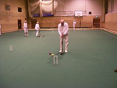 During the early stages of the match the home side's experience of playing on the indoor carpet was much in evidence, but as the visitors settled down to the unusual conditions of the carpet and hoops it must be said they began to take the conditions in their stride. However, despite a valiant effort by the visitors the home side manage to run out the overall winners by 12.5 to 5.5 games.