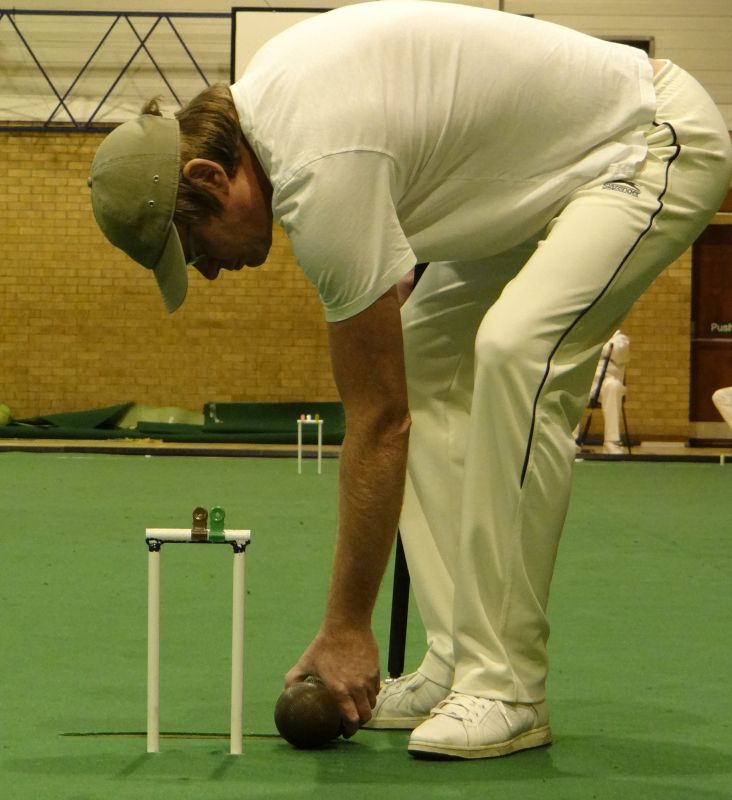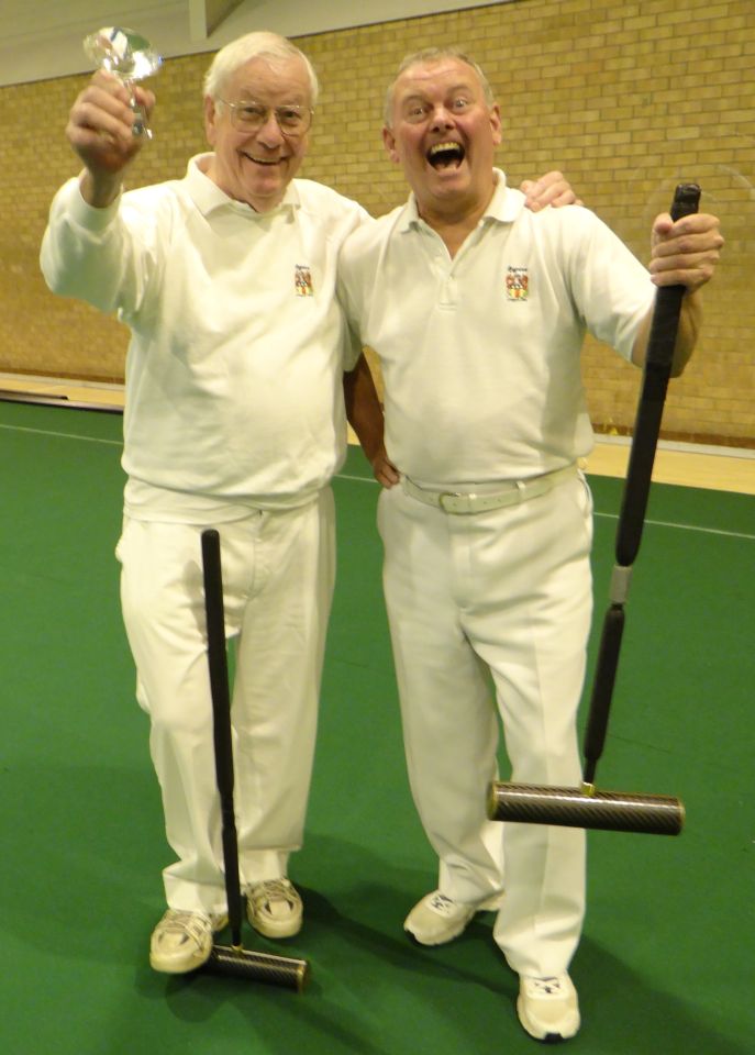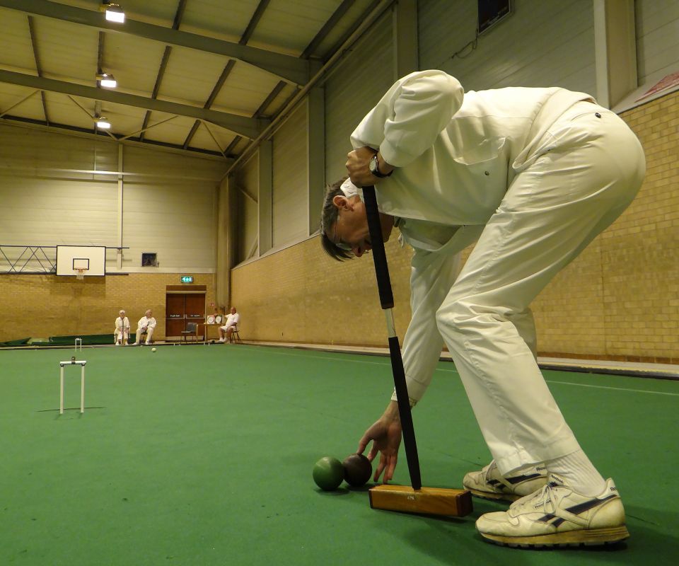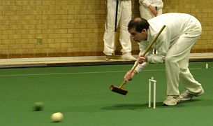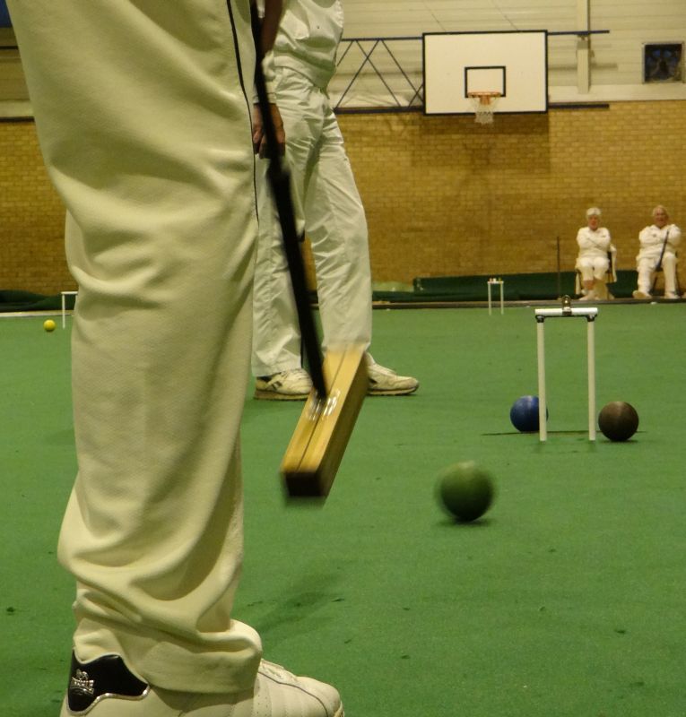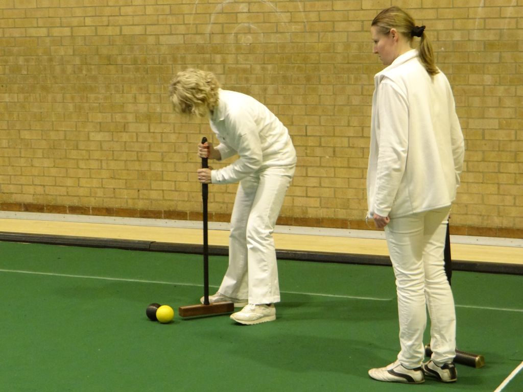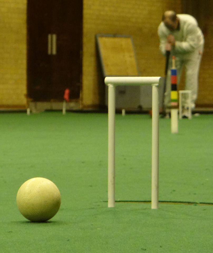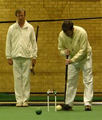 CroquetFollowing a surprise last minute withdrawal by one of our stalwart competitors, Terry Mahoney, who was admitted to hospital at the last moment, his place was taken by one of St. Albans' younger members Thomas Cullis, who partnered Chris Frost, making his first appearance on the indoors carpet. However, this did not seem to faze the pair of them and this proved true in their first game when they saw off the Ipswich pair of Martin French and Phil Eardley +10, the fancied pair for the day. This form continued throughout the day and despite running up against well battered, experienced indoor players they could not be stopped and managed to finish the day unbeaten.