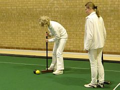 Association CroquetA first was achieved for the indoors this session with the introduction of Electronic Time Clocks for the first time. With a programme devised by the Federation Webmaster Simon Hathrell and two portable PCs kindly brought along by Duncan Hector this proved to be not only a novel but a much improved and efficient method of keeping time. Unfortunately for the time keepers, with the screens being clearly visible all over the hall, any slight delay in stopping or altering the clocks often brought out the anguished call from somewhere on the carpet of 'Timekeeper' from a disgruntled player worried that his valuable time was being wasted. However, it was generally agreed by all that it was a much improved system over the normal battery chess clocks.