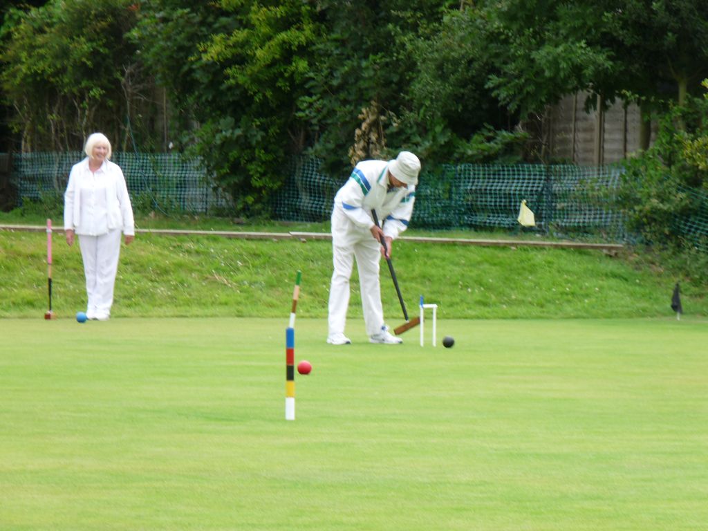 In the Handicap block A, Jason Carley of Watford and Barrie James of midSUFFOLK both stood on 3 wins apiece when they met in their final game of the block, in which Barrie ran out the winner seeing off Jason 7/3. In block B, Zandra Cardy of Colchester stood undefeated when she met Mike May from Bury St. Edmunds who had up to then suffered only one previous defeat. In a very close game Zandra ran out the winner 7/5 to meet Barrie in the final play-off. Despite having a 6 bisque advantage this proved to be a close game as Zandra managed to keep pace with Barrie gradually extracting these bisques. This game was so close that by the time play reached the 13th hoop and with all the bisques utilised it looked as if Zandra was in pole position when an unexpected clearance was missed, leaving an easy hoop for Barrie to run to take the group.