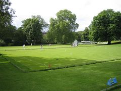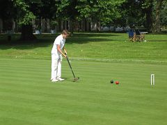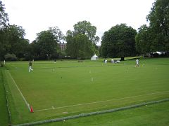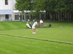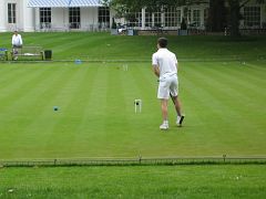 Oxford arrived a little late, and play was agreed for a 10:30 start in the usual 6-a-side format of morning doubles and afternoon singles, with the last two of the 8-strong Cambridge squad arriving breathlessly right on the half hour. The first problem: shoes. One of the Cambridge late arrivals was wearing ordinary town shoes with heels, definitely a no-no on the immaculate Hurlingham turf. So with those shoes banned he started play in bare socks, but it was not long before the groundsmen politely scotched that plan too, so after a bit of hunting around a spare pair of flat-soled shoes was procured from somewhere and play continued without further ado.