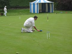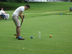 On the top court Will Gee (-1) and partner James Brind were up against Oxford's Harry Fisher (-1) and promising newcomer Rajiv Gogna, who had only taken up the game 3 weeks earlier but was already down to a 20 handicap. Both Will and Harry evidently intended to hold themselves back while hitting in long-range from time to time and coaxing their partners round as far as possible before embarking on n-tuple peels. But there the tactics diverged somewhat: while Harry kept his ball resolutely for hoop 1 and let his partner make occasional hoops himself, in order to gain enough control to peel his partner through hoops 1, 2 and 3 Will had to make 1 and 2 himself as well. The game progressed accordingly punctuated with some spectacular shooting, though with Will becoming quite concerned that some of his shots were missing by an unusually (for him) large margin, to the point where he suspected his mallet might have been damaged. Given the ferocity of his hitting one should perhaps not be so surprised.