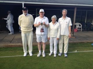 The morning's play consisted of 3 doubles and the St. Albans doubles pairing of Heather Bennett and Andrew Apps, playing consistently well, recorded an early victory over Norwich pair John Reddish and Sarah Barley. As predicted with lunch approaching the heavens opened and for 20 minutes due to the deluge the remaining players had to leave the lawn as playing conditions quickly deteriorated. However, the lawns quickly dried out and the remaining two games both went the distance finishing on time, leaving St Albans on 2 wins, Colchester on 1 and Norwich yet to register.