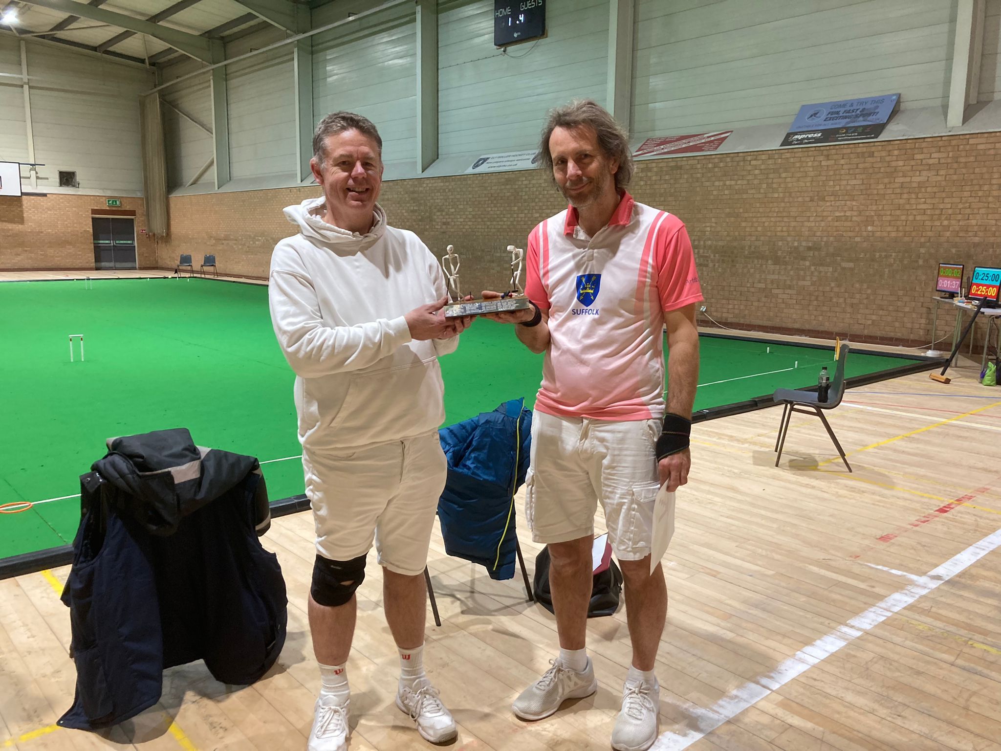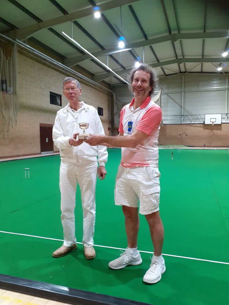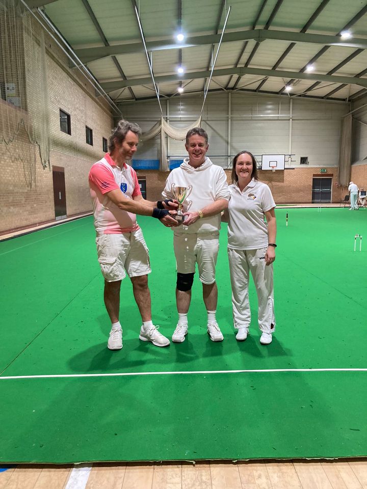 A low turn out for the day did not curb enthusiasm for the game with three rounds between each team, first normal speed doubles, then alternate shot speed doubles and finally the aggregate score from a pair of singles. The Peterborough pairing of Adrian Kirby and Paul Hetherington ran out winners ahead of the Letchworth team of Nick Mounfield and Heather Bennett. Norwich (Terrey Sparks and Sarah Barley) took the wooden spoon with no wins, although they had two losses by just one hoop along the way.