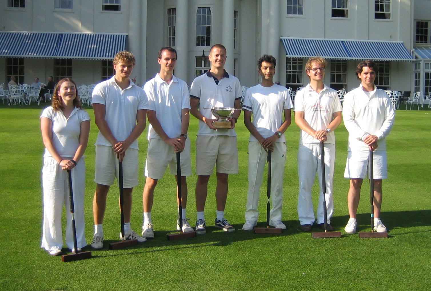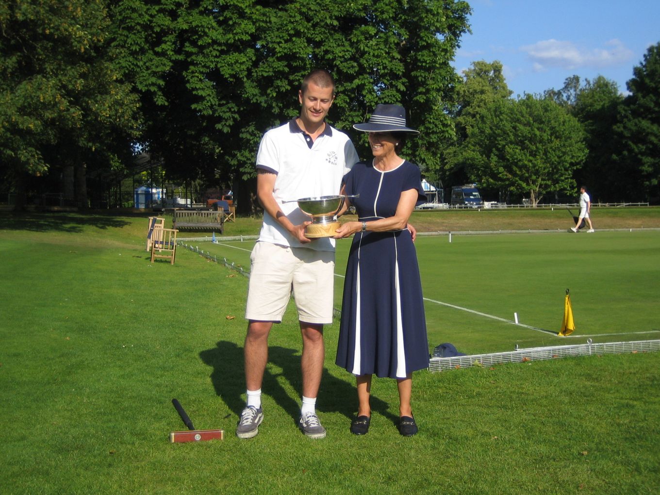 The trophy was presented to the Oxford captain Charlie Sharpe by a visiting Australian croquet celebrity, the ladies world-ranked no. 4 player... and proud mother Alison Sharpe.