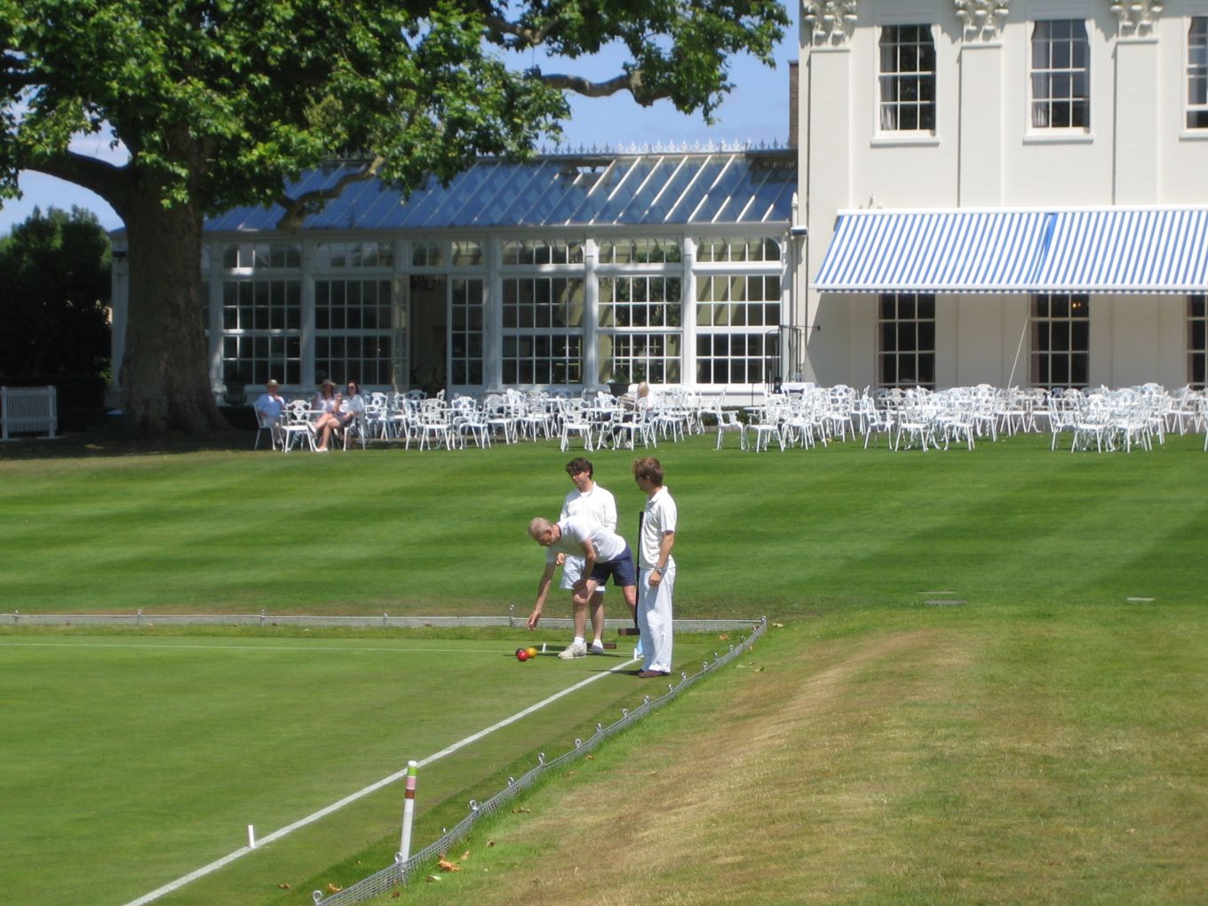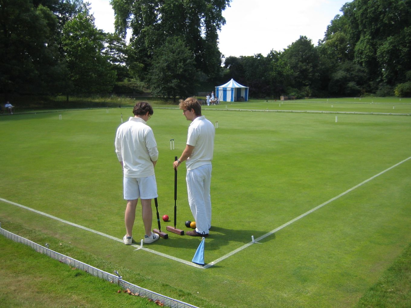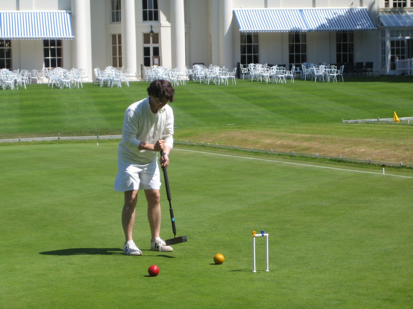 The Varsity match doubles games usually get off to a slow start as the players come to terms with the superbly maintained Hurlingham courts, much faster and smoother than the assorted patches of rough college grass that most of them are used to; though by most club standards the Hurlingham courts would be regarded as medium-paced with easy 1/8" hoop settings. This year was no exception. On the top court it was half an hour before the Oxford captain Charlie Sharpe finally made his first hoop with a break to 1-back; on the second court by this time just one hoop had been made by each side; and after an hour on the third court, where the solo Cambridge player was stoically defending against the odds, the Oxford pair had only managed to make 7 hoops by the time that a breathless Cambridge captain finally appeared with his clutch of mallets.