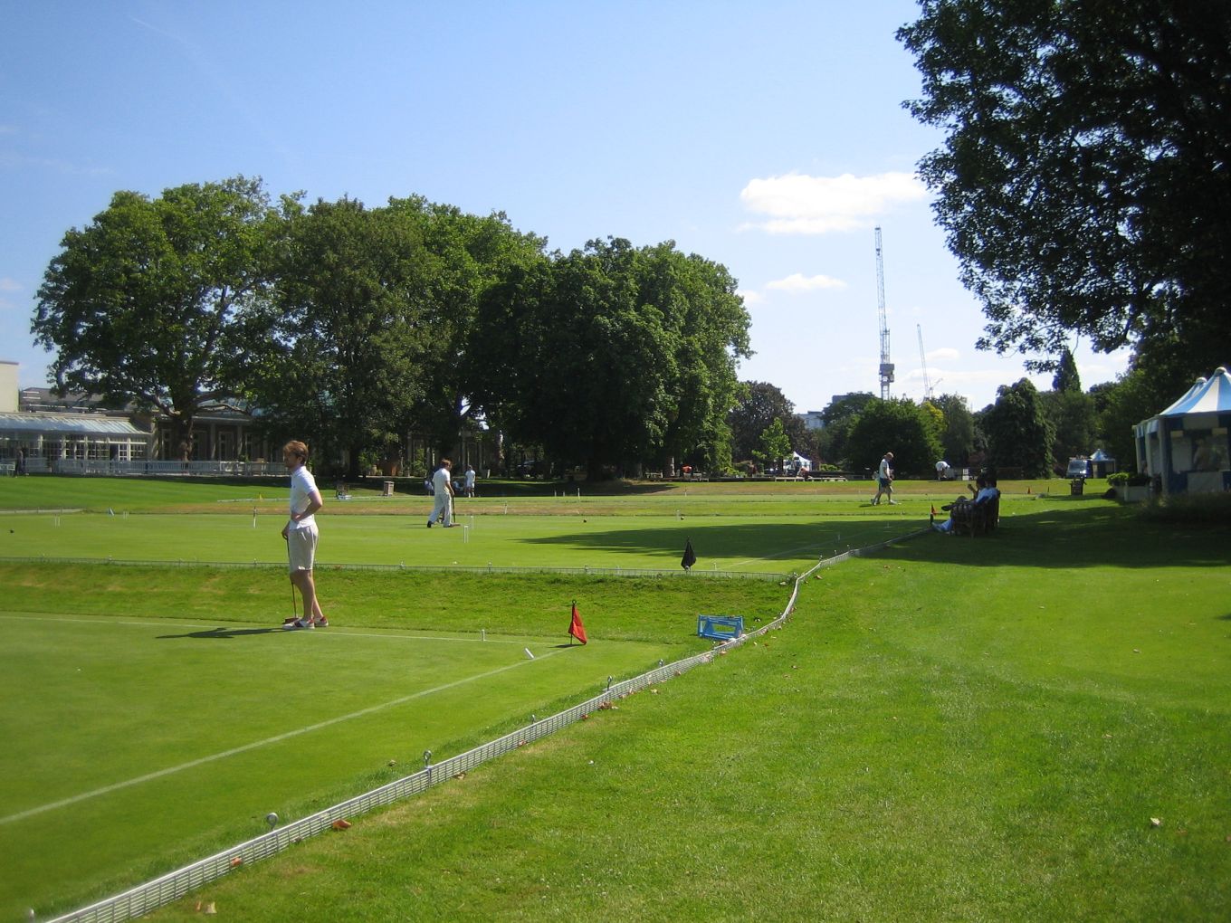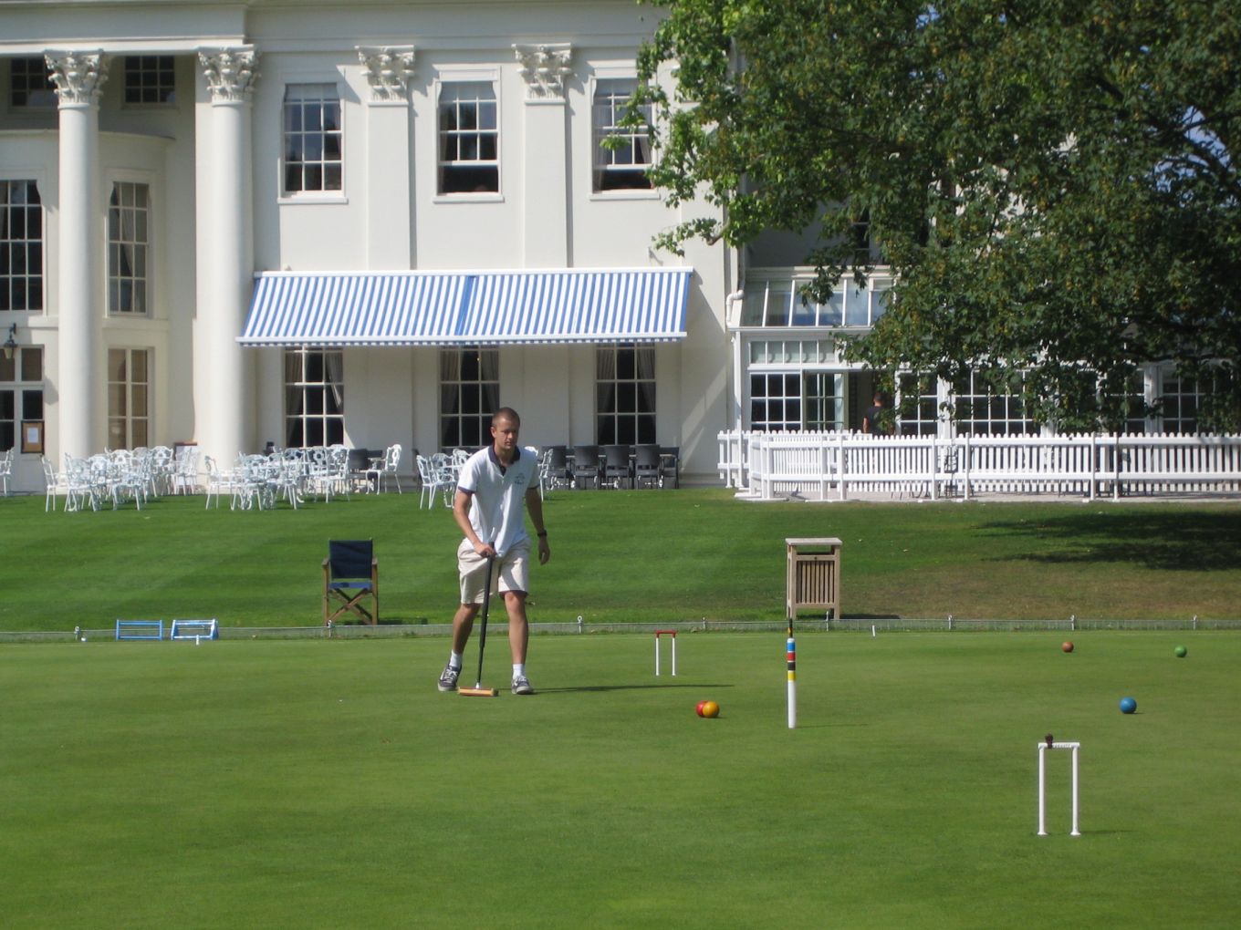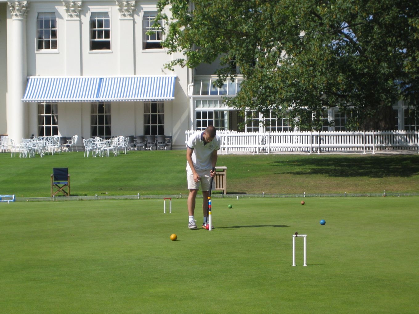 The Varsity match doubles games usually get off to a slow start as the players come to terms with the superbly maintained Hurlingham courts, much faster and smoother than the assorted patches of rough college grass that most of them are used to; though by most club standards the Hurlingham courts would be regarded as medium-paced with easy 1/8" hoop settings. This year was no exception. On the top court it was half an hour before the Oxford captain Charlie Sharpe finally made his first hoop with a break to 1-back; on the second court by this time just one hoop had been made by each side; and after an hour on the third court, where the solo Cambridge player was stoically defending against the odds, the Oxford pair had only managed to make 7 hoops by the time that a breathless Cambridge captain finally appeared with his clutch of mallets.