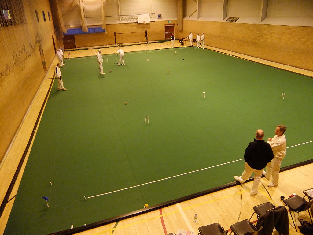 In order to cover expenses we have to allow as many people as possible to play during a weekend, so we play a version of Short Croquet double-banked doubles with time clocks. Each weekend usually comprises 8 club teams each day using a version of the short croquet rules that has developed over time to suit the indoor playing conditions, though exceptionally we can play with 7, 9 or even 10 teams in a day. The game has proved immensely popular and is particularly good for the social mixing of Clubs and players of all standards.